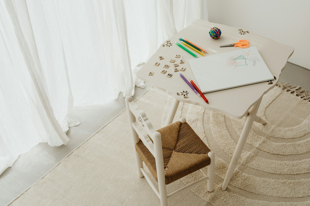 - Hopfällbara bord och stolar kan tas fram när det är dags att pyssla eller leka, och enkelt ställas undan när golvet ska vara fritt.