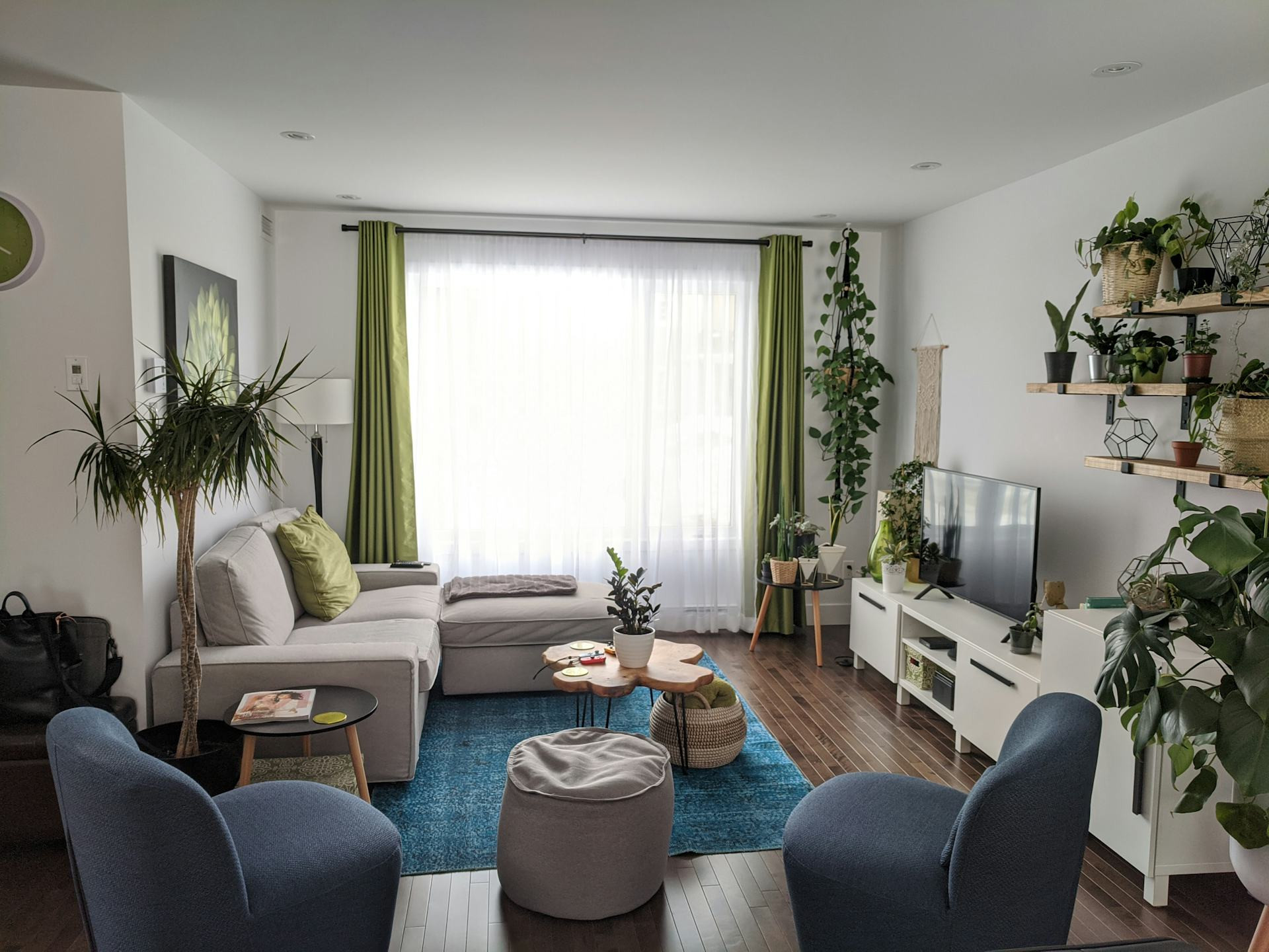För att konsten ska samspela med resten av inredningen kan du låta färger och material återkomma i kuddar, mattor och växter. Gröna växter förstärker den naturliga känslan, medan tunna gardiner och ljusa möbler gör rummet luftigt och soligt.